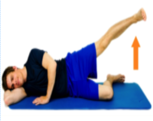 Start in a side plank position. Then lift your top leg without your body rocking. Hold 5-10 seconds or repeatedly lift the leg up and down for 10-20 reps. Make sure that you do not sway or tilt in your pelvis.