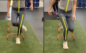 There is greater angle from her knee to her hip when landing on her right side compared to the left. But this image also highlights how her trunk is also leaning more to compensate when landing on her right side compared to her left. This indicates some instability still when landing.