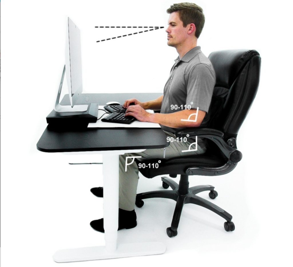 – The hands and wrists should be slightly below the elbows, with elbows resting on the armrests of your chair