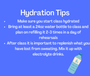 And let’s not forget about water!! Hydration is so important! Why you ask? Water keeps your muscles and joints moving freely to prevent fatigue and cramping. Water also helps keep our body cool. For this reason, always come to class with a full water bottle, no smaller than 24oz and be prepared to fill it multiple times during long rehearsal days.